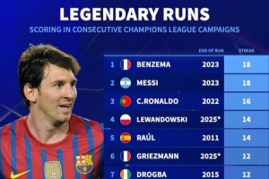 德轉(zhuǎn)列歐冠賽季連續(xù)進(jìn)球榜:本澤馬、梅西18年并列居首,C羅16年