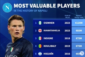 那不勒斯隊史球員身價排行:奧斯梅恩1.2億歐第一,K77第二