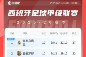西甲積分榜:皇馬10輪領(lǐng)先巴薩5分,黃潛第三,馬競第四