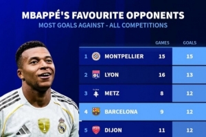 姆巴佩生涯進球最多球隊前十:唯一非法國球隊就是巴薩 9場轟12球