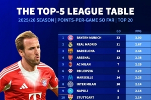 本賽季五大聯(lián)賽場(chǎng)均拿分榜:拜仁3分拿滿(mǎn) 皇薩槍列前四、巴黎第12