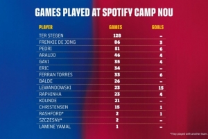 即將回歸!巴薩當前隊內(nèi)諾坎普出場榜:特獅、德容、佩德里列前三