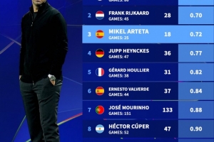 阿爾特塔帶阿森納參加25場歐冠僅丟18球,場均0.72球排在歷史第三
