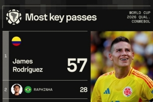 本屆南美世預(yù)賽關(guān)鍵傳球榜:J羅57次斷層居首,梅西25次第五