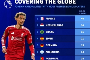 英超各國外援?dāng)?shù):法國40人、荷蘭36人、巴西31人、西班牙21人