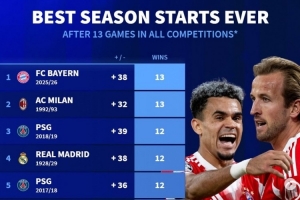 德轉列五大聯(lián)賽球隊賽季前13場最佳開局:拜仁&92年米蘭并列居首