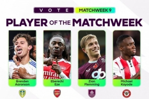英超官方評(píng)第9輪最佳球員候選:埃澤、姆伯莫領(lǐng)銜,范德芬在列