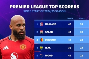 上賽季至今英超射手榜:哈蘭德反超薩拉赫,姆伯莫、伊薩克列前四