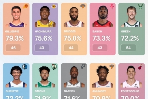 接球投籃有效命中率榜:八村塁75.6%第二 伊森73.3%第四