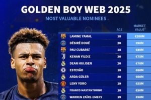 2025金童獎(jiǎng)候選身價(jià)榜:亞馬爾2億歐 杜埃、伊爾迪茲、赫伊森在列