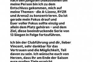 經(jīng)過近期關(guān)于我個人的討論后,我已決定將精力專注于當(dāng)前事務(wù)——A級教練證書課程、RYZR項(xiàng)目以及Arena2計(jì)劃。這些是我現(xiàn)階段的重心,而你們的全部注意力應(yīng)當(dāng)集中在賽場——以及延續(xù)當(dāng)前13場連勝的卓越戰(zhàn)績。