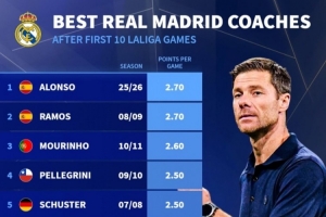 德轉(zhuǎn)列皇馬主帥執(zhí)教前10場(chǎng)西甲場(chǎng)均拿分榜: