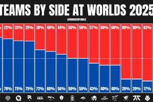 體育資訊10月28日訊 外媒統(tǒng)計S15全球總決賽各隊紅藍方占比,具體如下(以下僅介紹八強隊伍):