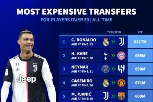 30歲以上球員轉(zhuǎn)會(huì)費(fèi)榜:C羅33歲1.17億歐居首 凱恩內(nèi)馬爾分列二三