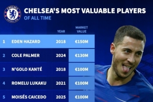 德轉(zhuǎn)列切爾西隊(duì)史身價(jià)最高榜:阿扎爾18年1.5億,帕爾默去年1.3億
