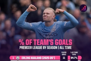 依賴!哈蘭德本賽季聯(lián)賽進(jìn)球占比全隊(duì)64.7%,英超歷史最高