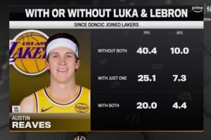 里夫斯場(chǎng)均數(shù)據(jù):無(wú)詹無(wú)東40.4分10助 有詹有東20分4.4助