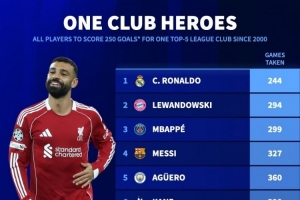 在單一球隊(duì)進(jìn)250球所用場次:C羅244場、梅西327場、薩拉赫415場