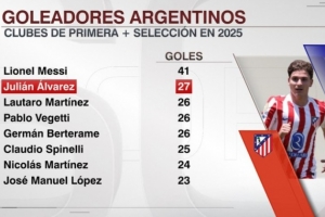 僅次梅西!阿爾瓦雷斯2025年俱樂部和阿根廷國家隊已打進27球