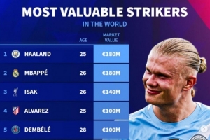 中鋒德轉(zhuǎn)身價排行:哈蘭德、姆巴佩1.8億歐最高,伊薩克1.4億歐
