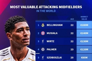 進(jìn)攻型中場(chǎng)身價(jià)榜:貝林厄姆1.8億歐居首,穆西亞拉、維爾茨前三