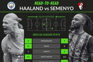 哈蘭德與塞梅尼奧數(shù)據(jù)對比:前者進球和射門更多,后者助攻數(shù)占優(yōu)