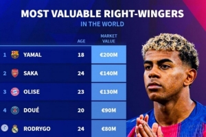 體育資訊11月3日訊 德轉(zhuǎn)列當(dāng)前世界足壇右邊鋒身價排行,亞馬爾2億歐居首,薩卡1.4億歐第二,奧利塞1.3億歐第三。
