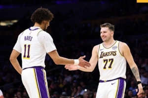 東契奇和海斯擊掌慶祝!湖人曬贏球海報:今晚洛杉磯很吵