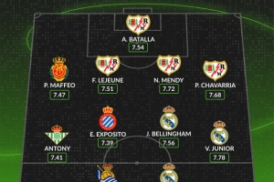 WhoScored西甲10月最佳陣:姆巴佩、安東尼、貝林、維尼修斯在列