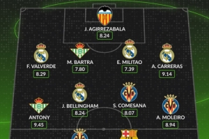西甲本周最佳陣容公布:安東尼以9.45高分領(lǐng)銜,皇馬4將入選
