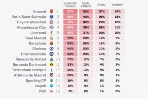 歐冠奪冠概率:阿森納超22%獨(dú)一檔,巴黎拜仁曼城利物浦皇馬2-6位