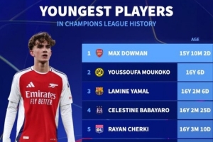 歐冠歷史最年輕出場(chǎng)球員排行:道曼居首,穆科科、亞馬爾二三位