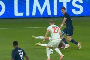 體育資訊11月05日訊 歐冠聯(lián)賽階段第4輪,巴黎對陣拜仁。44分鐘,基米希爭搶中倒地,隨后頭部被法比安踢到,裁判沒有表示。