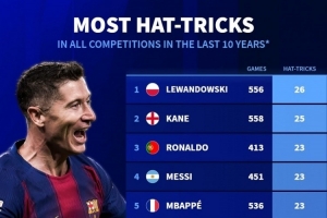 近10年戴帽次數(shù)排名(前十聯(lián)賽+杯賽+國(guó)家隊(duì)):