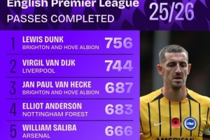 本賽季英超成功傳球榜: