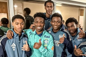 維尼修斯隨巴西隊(duì)在阿森納基地訓(xùn)練,與槍手青訓(xùn)小將合影