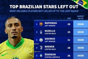 落選巴西隊(duì)球員身價(jià)榜:拉菲尼亞9000萬(wàn)歐居首,穆里略5500萬(wàn)歐
