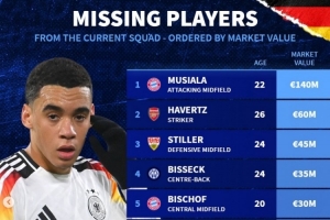 德國落選本期國家隊(duì)球員身價(jià)榜:穆西亞拉1.4億歐居首 哈弗茨第二