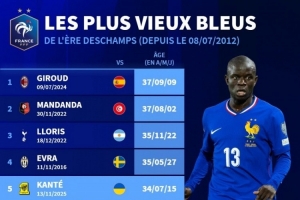 體育資訊11月15日訊 世預(yù)賽歐洲區(qū)比賽,坎特踢滿全場,幫助法國主場4-0擊敗烏克蘭,德轉(zhuǎn)列出了德尚執(zhí)教法國隊(duì)以來年齡最大出場球員排名,吉魯居首,坎特排在第5位。