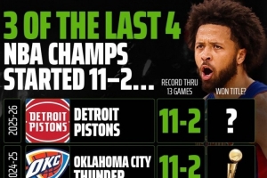 冠軍咯?過去4年總冠軍有3隊(duì)開局11勝2負(fù)!而今年活塞也是11勝2負(fù)