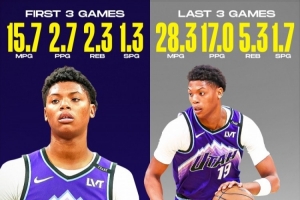 在他的生涯前三場(chǎng)比賽,他場(chǎng)均出場(chǎng)15.7分鐘,拿到2.7分2.3籃板1.3搶斷;而在最近三場(chǎng)比賽,他場(chǎng)均出場(chǎng)28.3分鐘,可以拿到17分5.3籃板1.7搶斷。