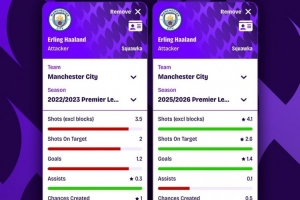 哈蘭德本賽季每90分鐘進(jìn)1.4球、爭(zhēng)頂成功率72%,均高于22-23賽季
