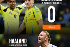 檔次差距?哈蘭德8場(chǎng)16球頭名進(jìn)世界杯,瑞典2.7億鋒線4場(chǎng)1球墊底