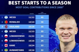 新世紀賽季開局參與進球最多榜:哈蘭德本賽季已35球,僅次梅、羅