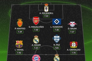 WhoScored本賽季至今五大聯(lián)賽最佳陣:姆巴佩、凱恩、亞馬爾在列
