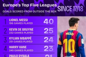 17-18賽季以來五大聯(lián)賽禁區(qū)外進(jìn)球:梅西40球最多,丁丁25球次席