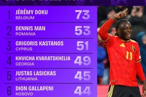 世預(yù)賽進(jìn)入禁區(qū)次數(shù)榜:德布勞內(nèi)73次列第三,德佩、佩里西奇在列