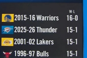 雷霆前16場至少15勝!近30年第4支衛(wèi)冕冠軍 前3支有2支奪冠!