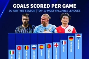 身價(jià)前10聯(lián)賽本賽季場(chǎng)均進(jìn)球榜:荷甲、德甲、法甲前三,意甲墊底