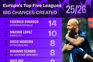 本賽季五大聯(lián)賽創(chuàng)造重大機(jī)會榜:迪馬爾科14次居首,帕斯8次第三